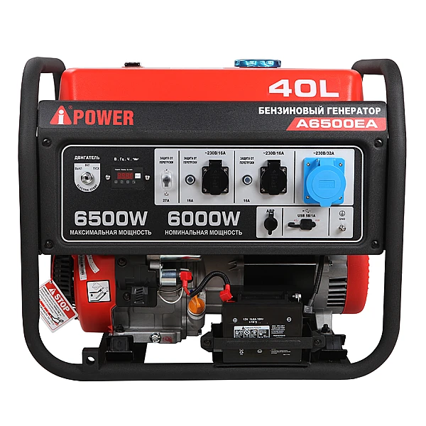 Бензиновый генератор A-iPower A6500EA - топовая модификация 6-киловаттной линейки производителя, которая оборудована электростартером, коннектором для подключения опционального блока автозапуска и большим топливным баком. Все это делает агрегат универсальным - его можно успешно использовать как в качестве резервной электростанции в частном доме, предприятиях сферы торговли и общепита, так и в роли мощного и надежного источника питания для приборов и инструментов на стройке, в мастерской и т.д.