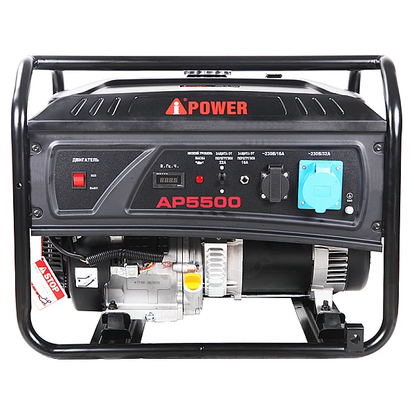На передней панели мини бензогенератора A-iPower Lite AP5500 расположена евророзетка 230В/16А и силовой выход на 32А, который позволяет направить полную мощность установки на одного потребителя. Обе закрыты подпружиненными крышками, что гарантирует безопасность при работе в плохую погоду.