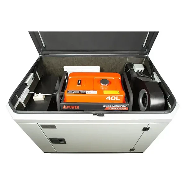 Бензиновый генератор A-iPower A7000EAX в супертихом зимнем кожухе 1400SS RAL 7024 - надежный источник питания мощностью 6.5 кВт. Главные преимущества модели - до 12 часов работы на одном баке топлива и возможность подключения высоко индуктивных приборов с пусковой мощностью до 14 кВA.