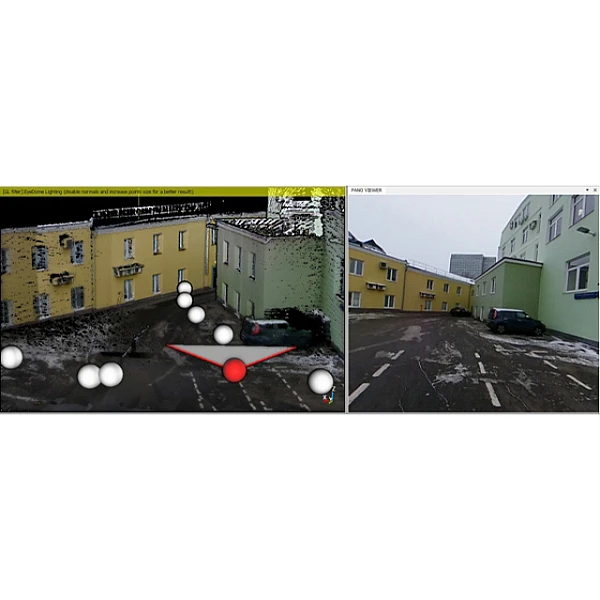 В программном обеспечении Goslam Studio имеется возможность просматривать панорамные геопривязанные фотоизображения, с указанием просматриваемой области на 3D виде.