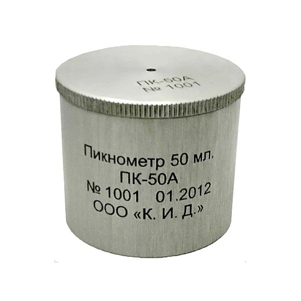 Алюминиевый пикнометр емкостью 50 мл. представляет собой стакан с притертой крышкой, на которой имеется отверстие для выпуска излишков испытуемого материала. Пикнометр изготавливается из твердого алюминиевого сплава с низким коэффициентом температурного расширения.