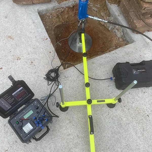 «Упор-1» использует самый достоверный способ определения деформационных характеристик. По нему рассчитываются корректирующие коэффициенты на динамические методы. В ходе подачи системы давлений на опорную плиту датчик линейных перемещений фиксирует деформации покрытия. На основе зависимости нагрузка/осадка вычисляются модуль деформации, модуль упругости и относительный показатель уплотнения.