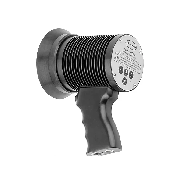Переносной светодиодный УФ светильник Элитест УФС-220 (УФС-220 BLACK LIGHT) предназначен для качественного выявления дефектов при использовании люминесцентных материалов в капиллярной и магнитопорошковой дефектоскопии. Десять мощных диаметрально расположенных ультрафиолетовых светодиодов с индивидуальными линзами обеспечивают необходимый угол раскрытия светового потока для формирования высокой и равномерной интенсивности УФ излучения на большой области контроля. Три белых светодиода предназначены для осмотра объекта контроля в видимом свете. Встроенный контроллер позволяет с помощью комбинированного многофункционального энкодера регулировать интенсивность ультрафиолетового и видимого освещения, а так же осуществлять простое и функциональное управление алгоритмом работы светильника. При включении светильника и переключении режимов его работы заданная интенсивность излучения достигается практически мгновенно.